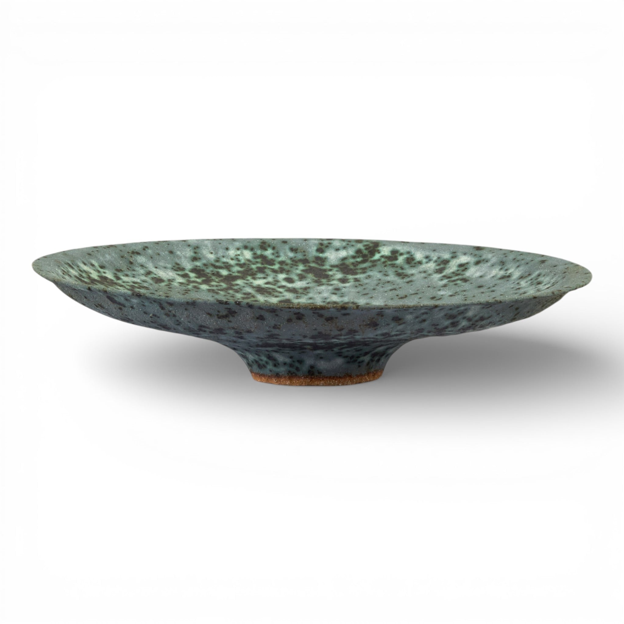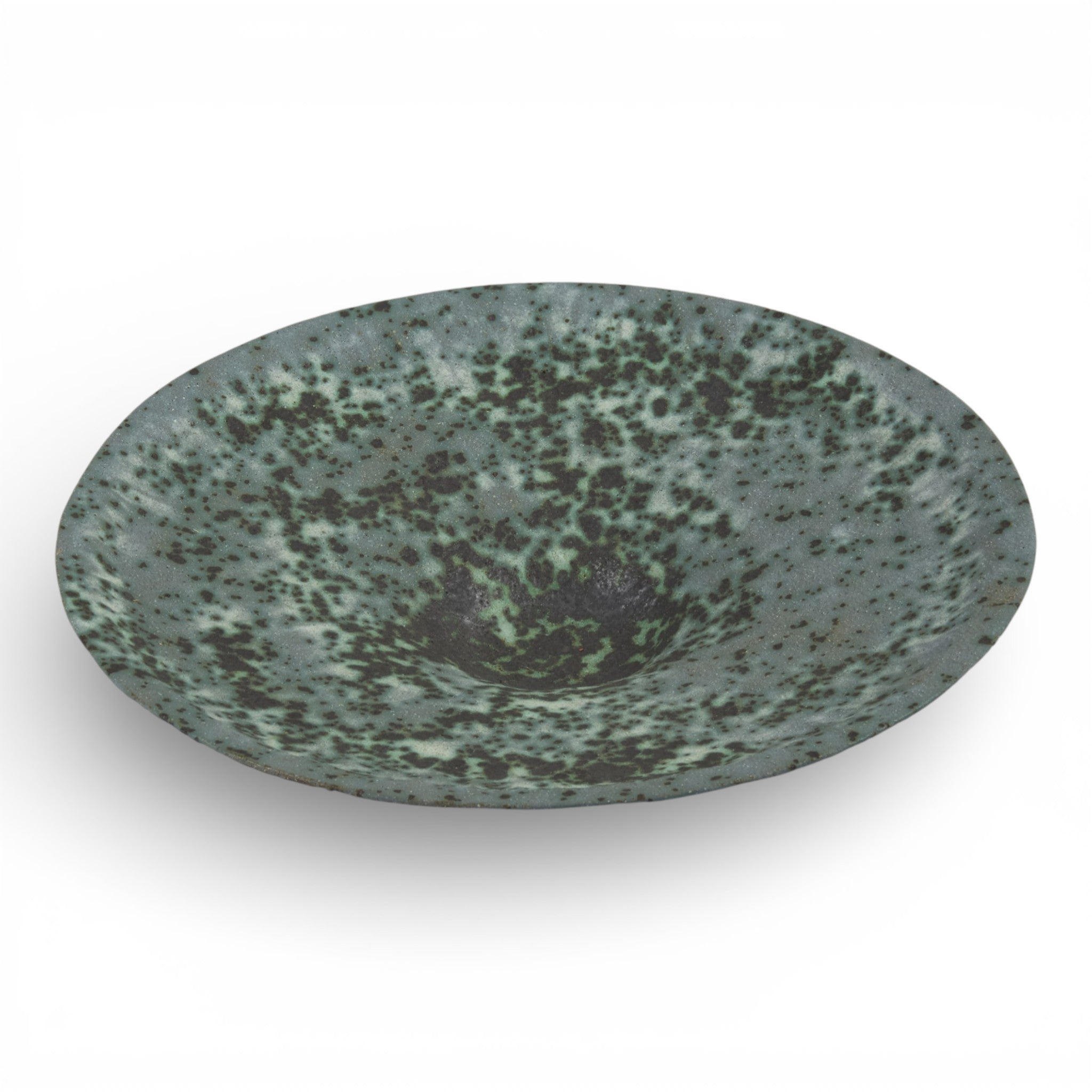 Finished in a richly speckled glaze with soft tonal variation, the surface has depth and texture that shifts subtly in changing light. The low profile makes it ideal as a statement centrepiece or styled empty to highlight its sculptural simplicity.