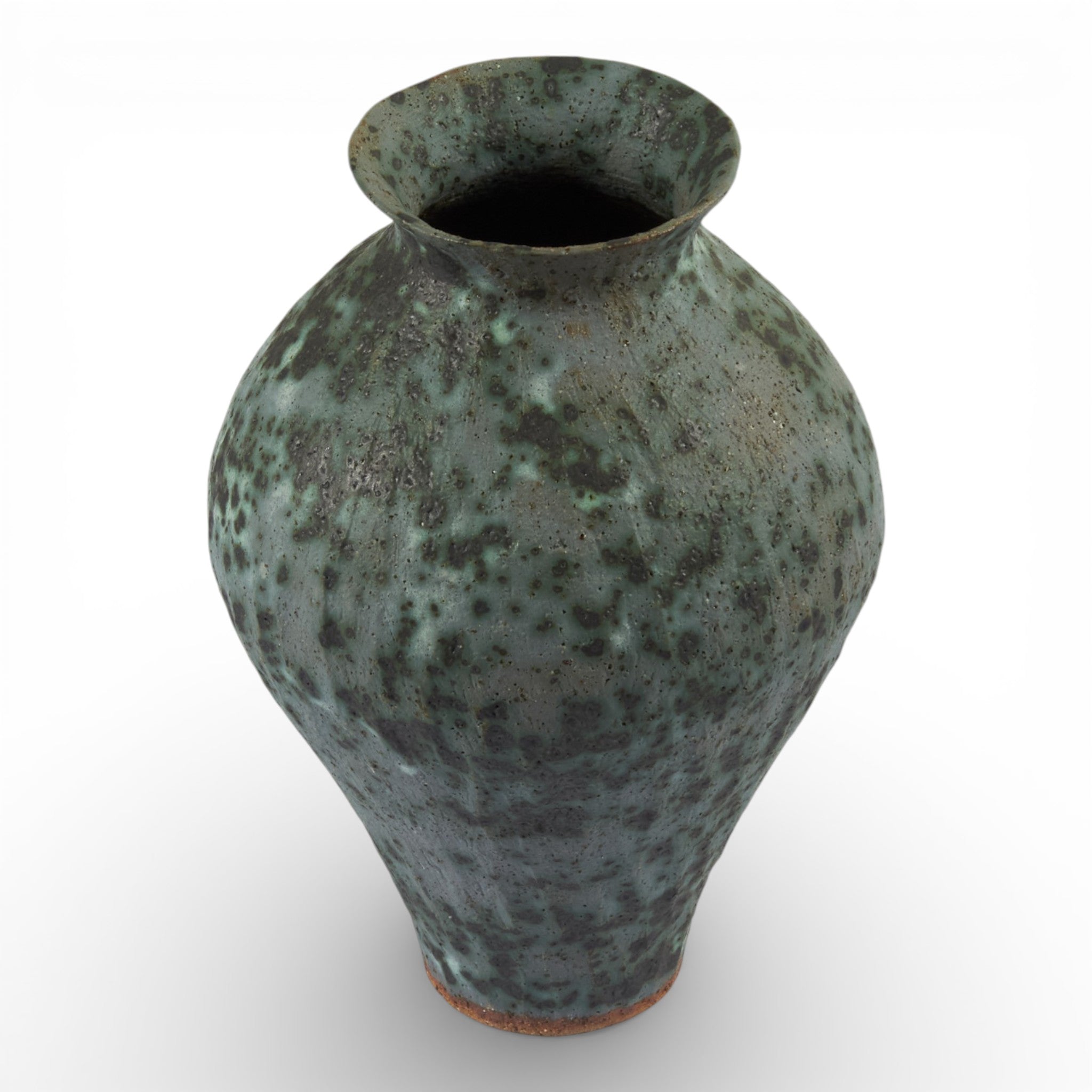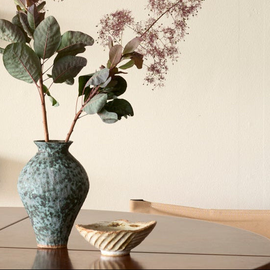 This sculptural stoneware vase by Australian ceramicist Emily Belle Ellis features a softly rounded amphora form with a gently flared neck and tapered base. Finished in a layered green copper glaze, the surface has rich tonal variation with organic mottling and depth.