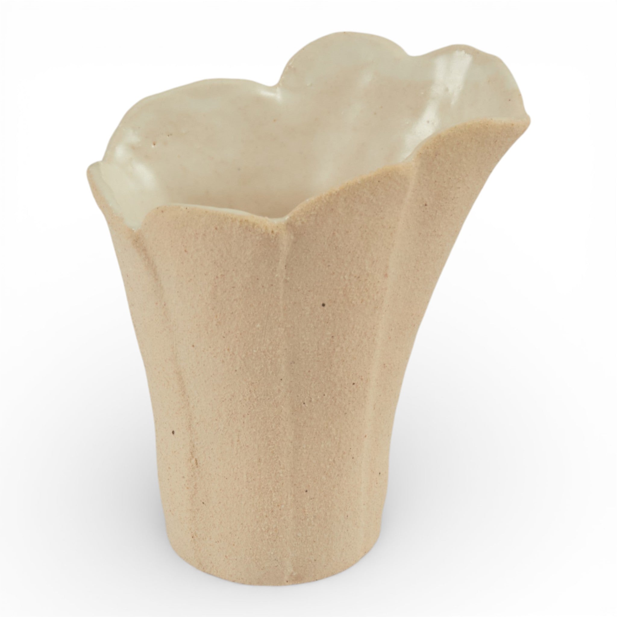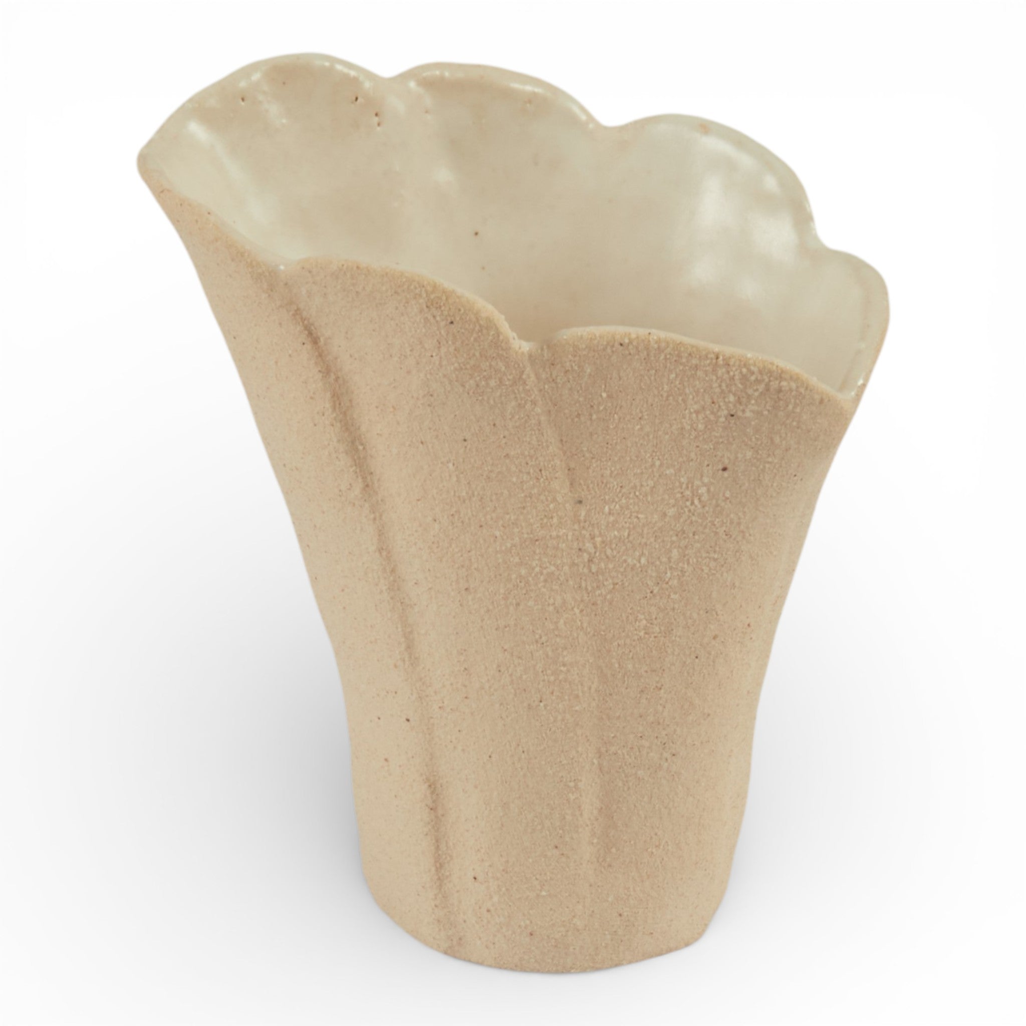 This ceramic vase by Tee McManus features a textured, sandy white exterior paired with a smooth glazed interior. Handcrafted using traditional techniques, the softly flared rim and faceted form create a strong sculptural silhouette, while the raw, tactile surface adds depth and contrast.