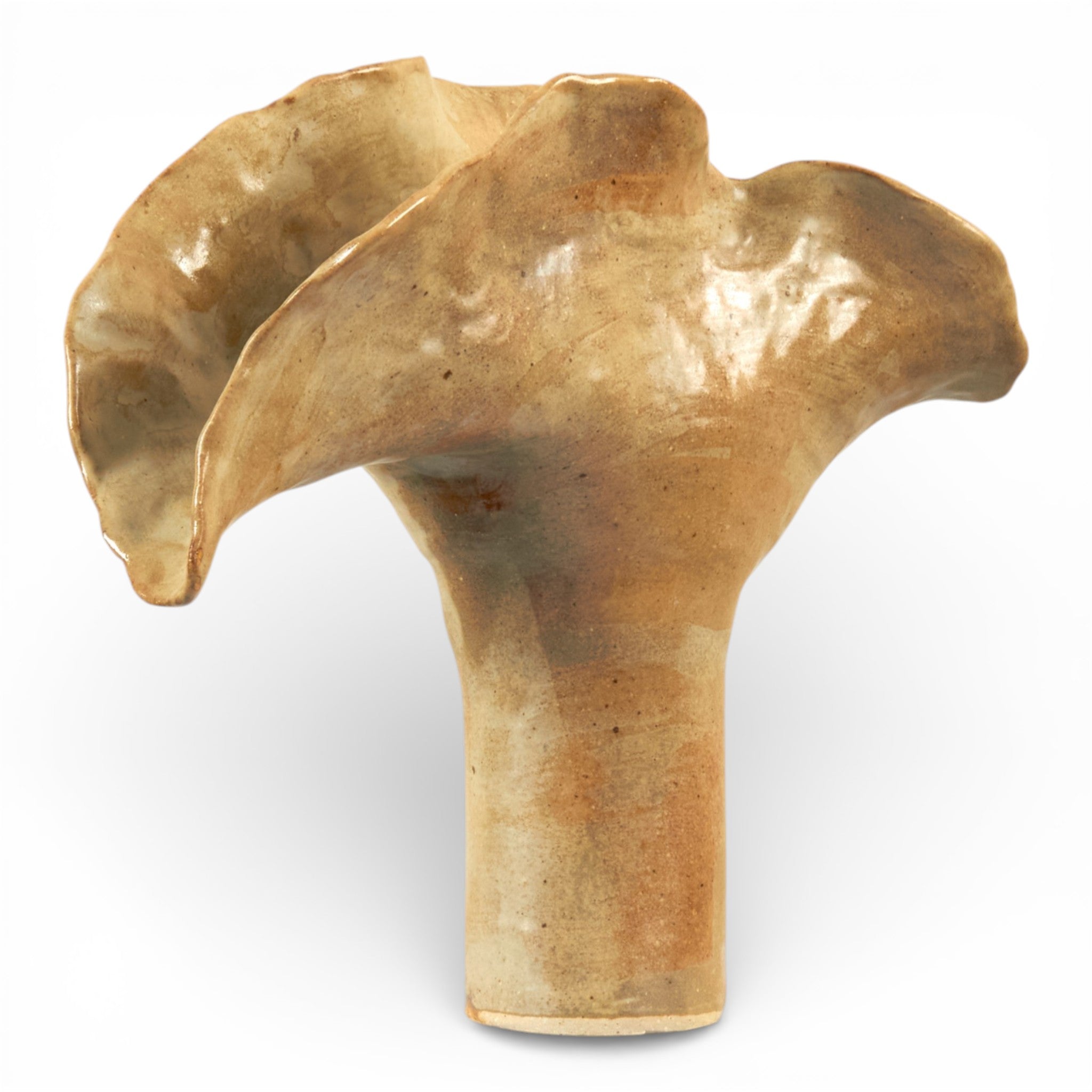 This ceramic vase by Tee McManus features a soft stone glaze layered with warm sand and light clay tones. Handcrafted using traditional techniques, the wide flared rim and gently undulating edge create a sculptural silhouette, while subtle surface markings and tonal variation highlight its hand-built finish.