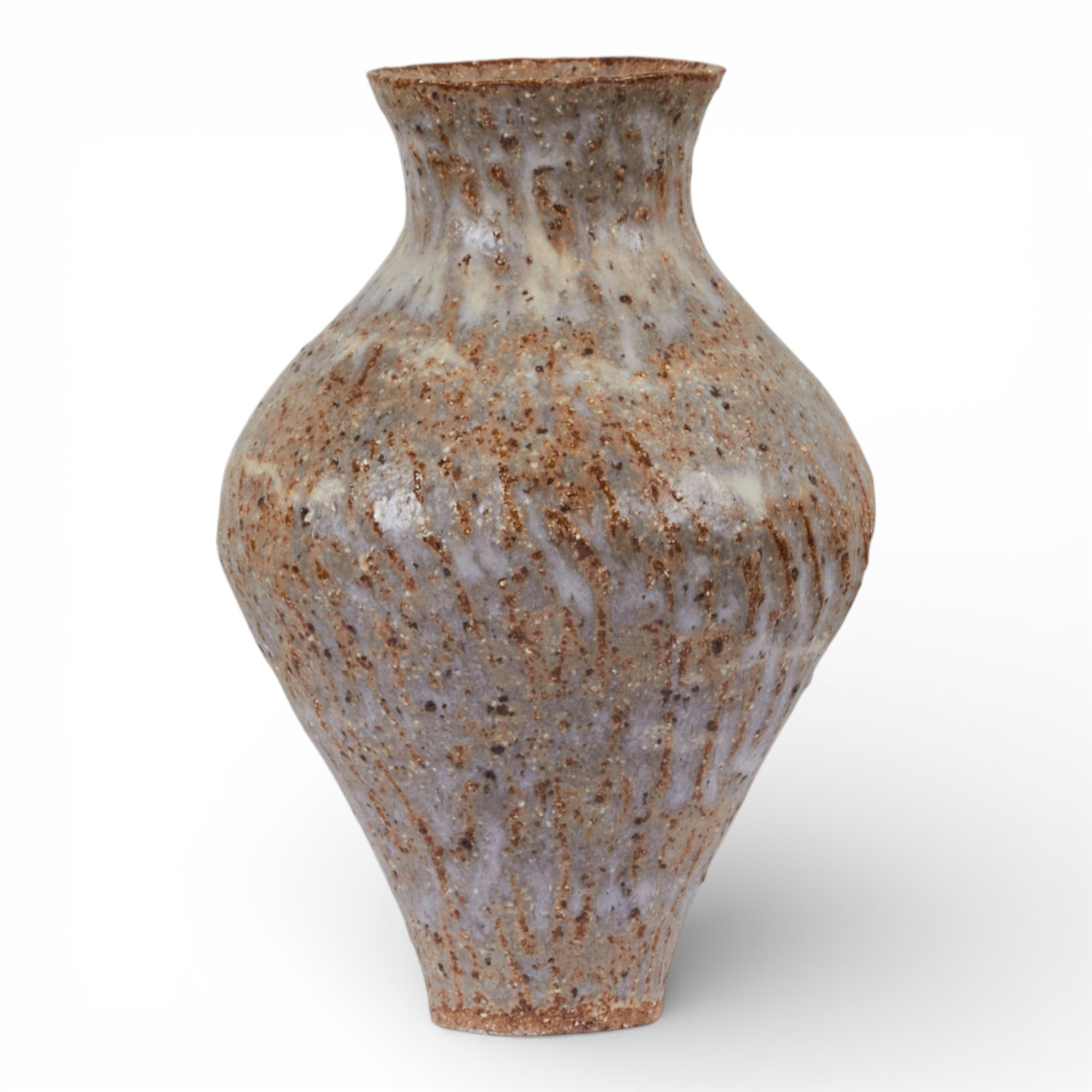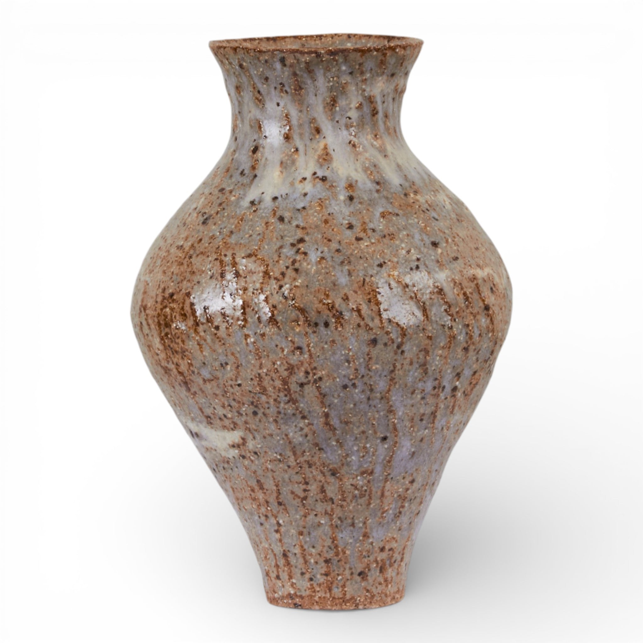 This sculptural stoneware vase by Australian ceramicist Emily Belle Ellis features a softly rounded amphora form with a gently flared neck and subtle carved texture through the body. Finished in a warm glaze layered with earthy speckling and natural variation, the surface has a beautifully weathered, tactile quality.