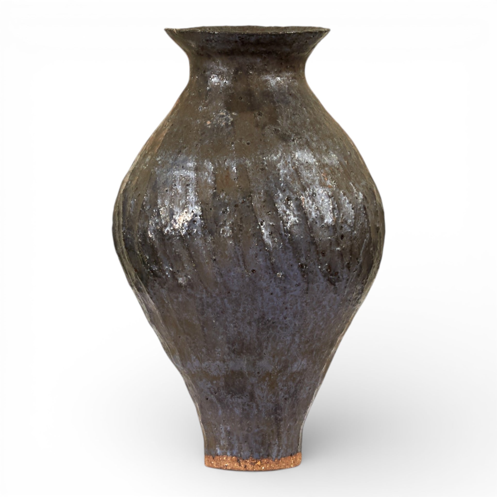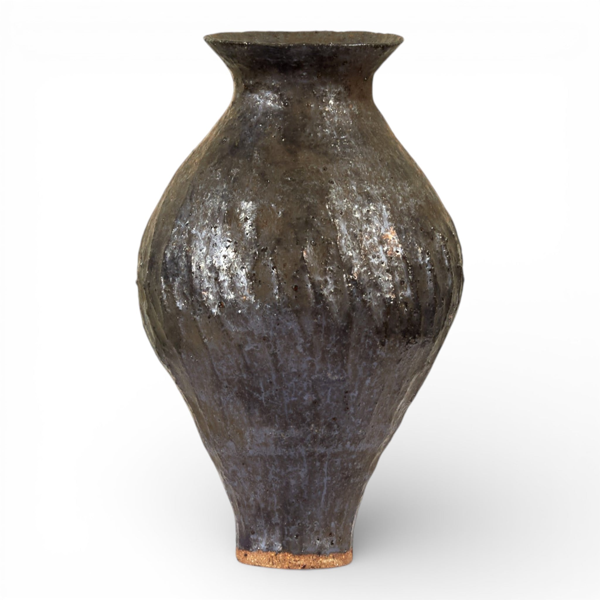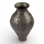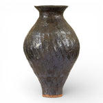 This sculptural stoneware vase by Australian ceramicist Emily Belle Ellis features a classic amphora-inspired silhouette with a softly flared neck and carved vertical ridging through the body. Finished in a smoky, slightly shimmery glaze with cratered texture and subtle tonal variation, the surface has a raw, weathered character.