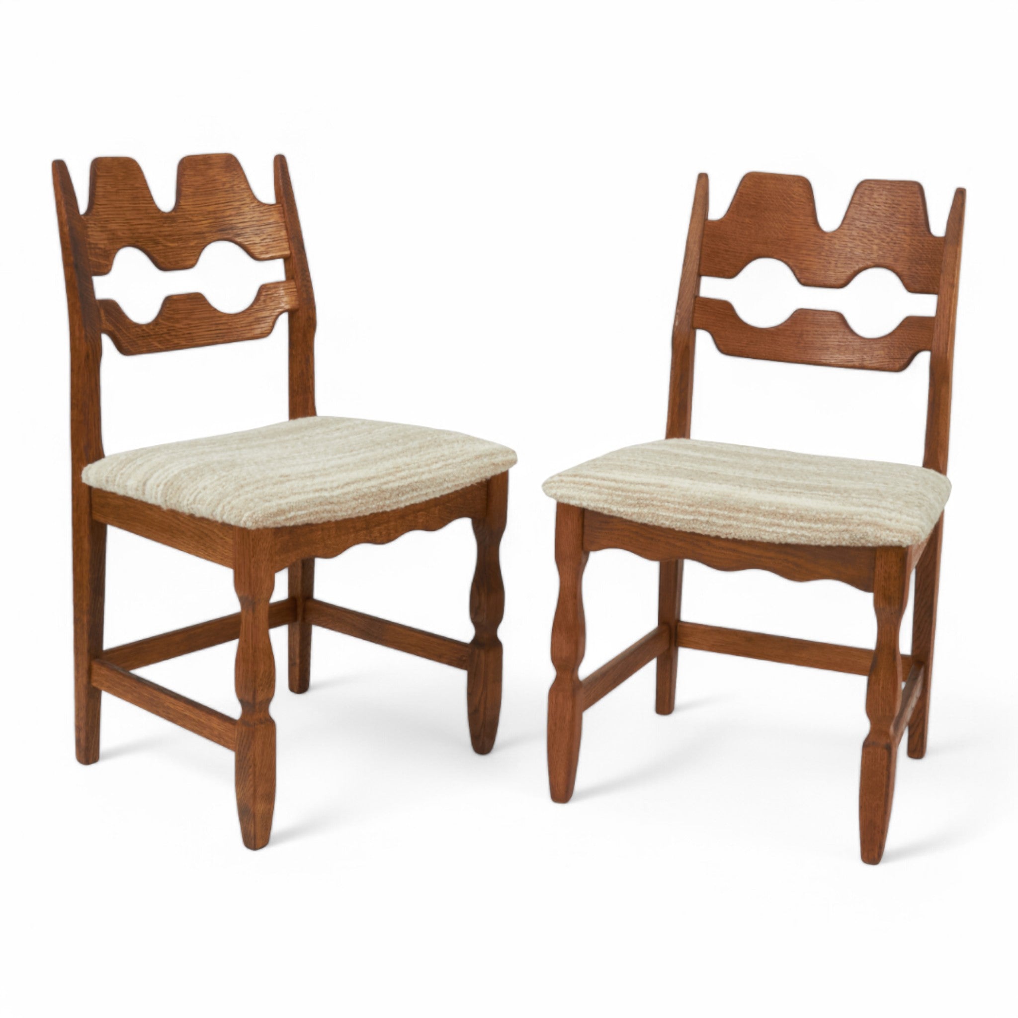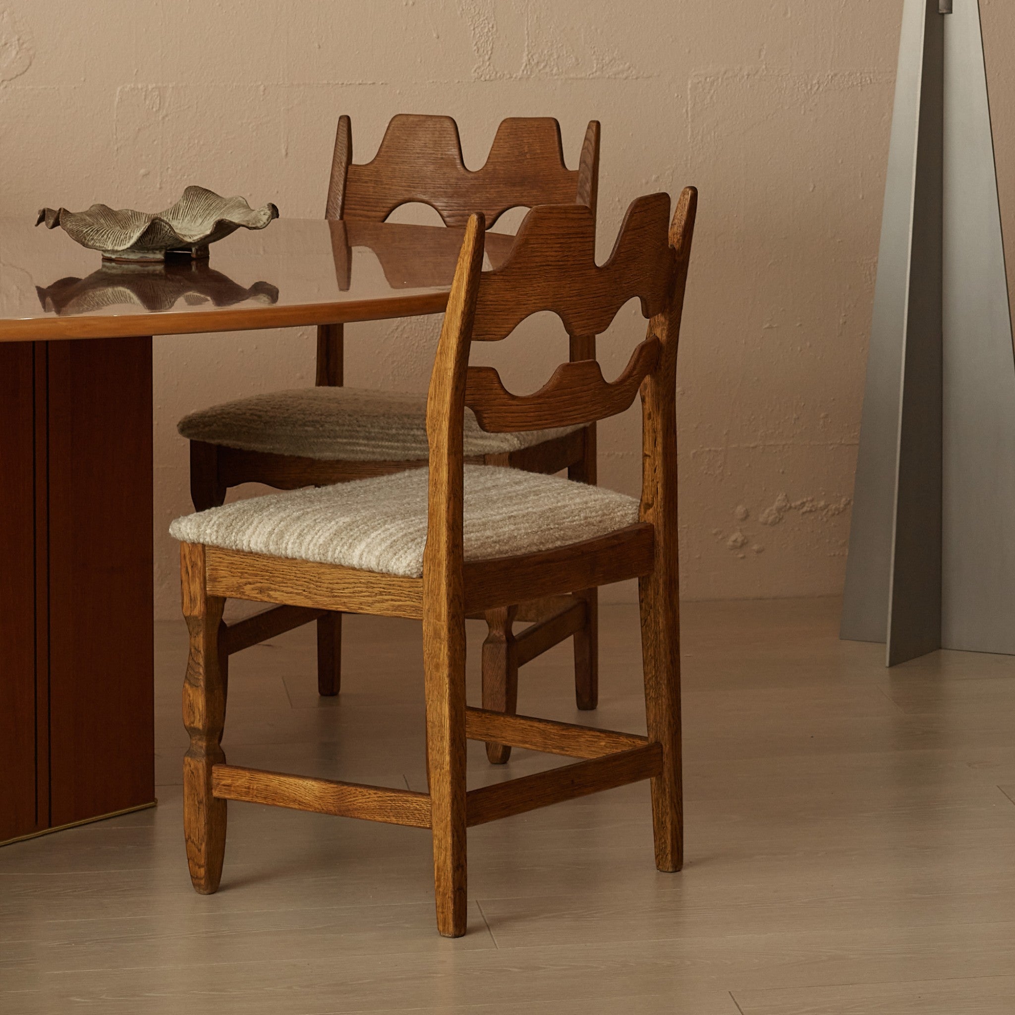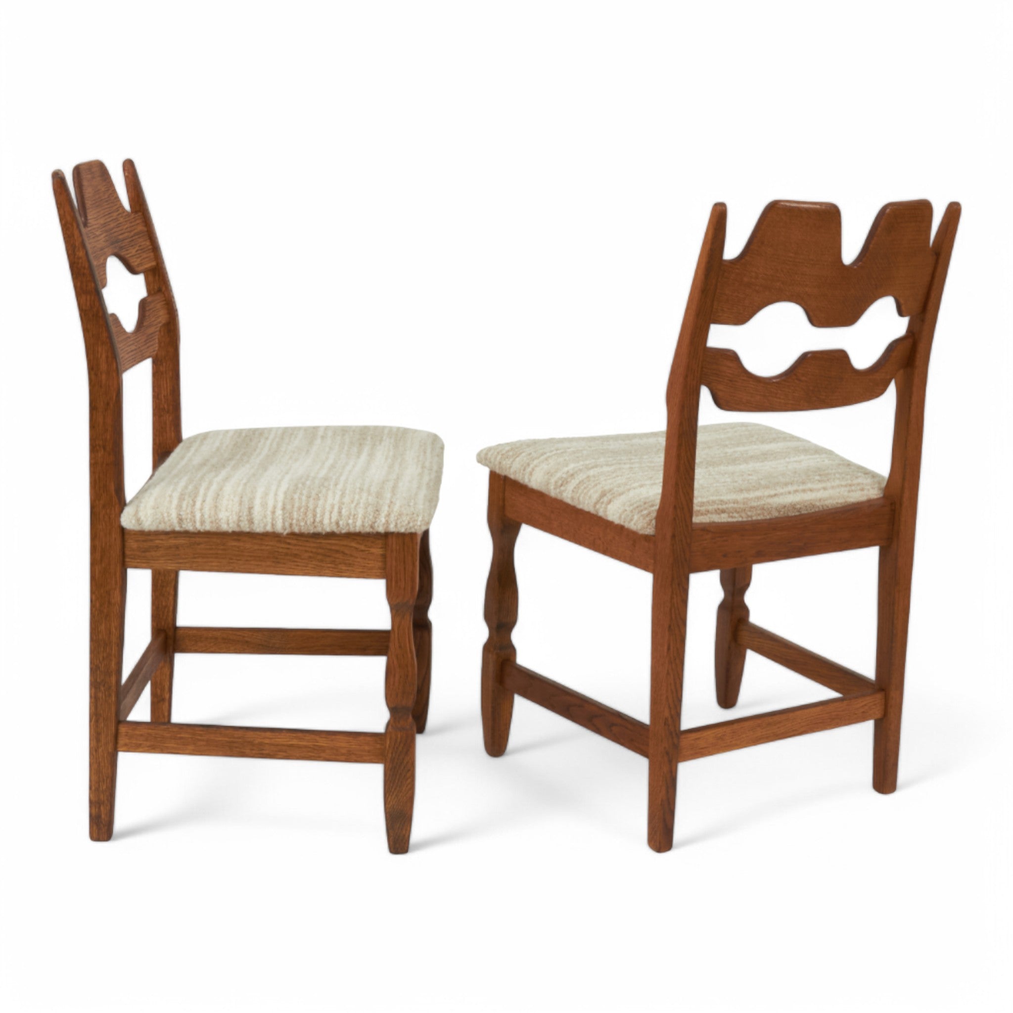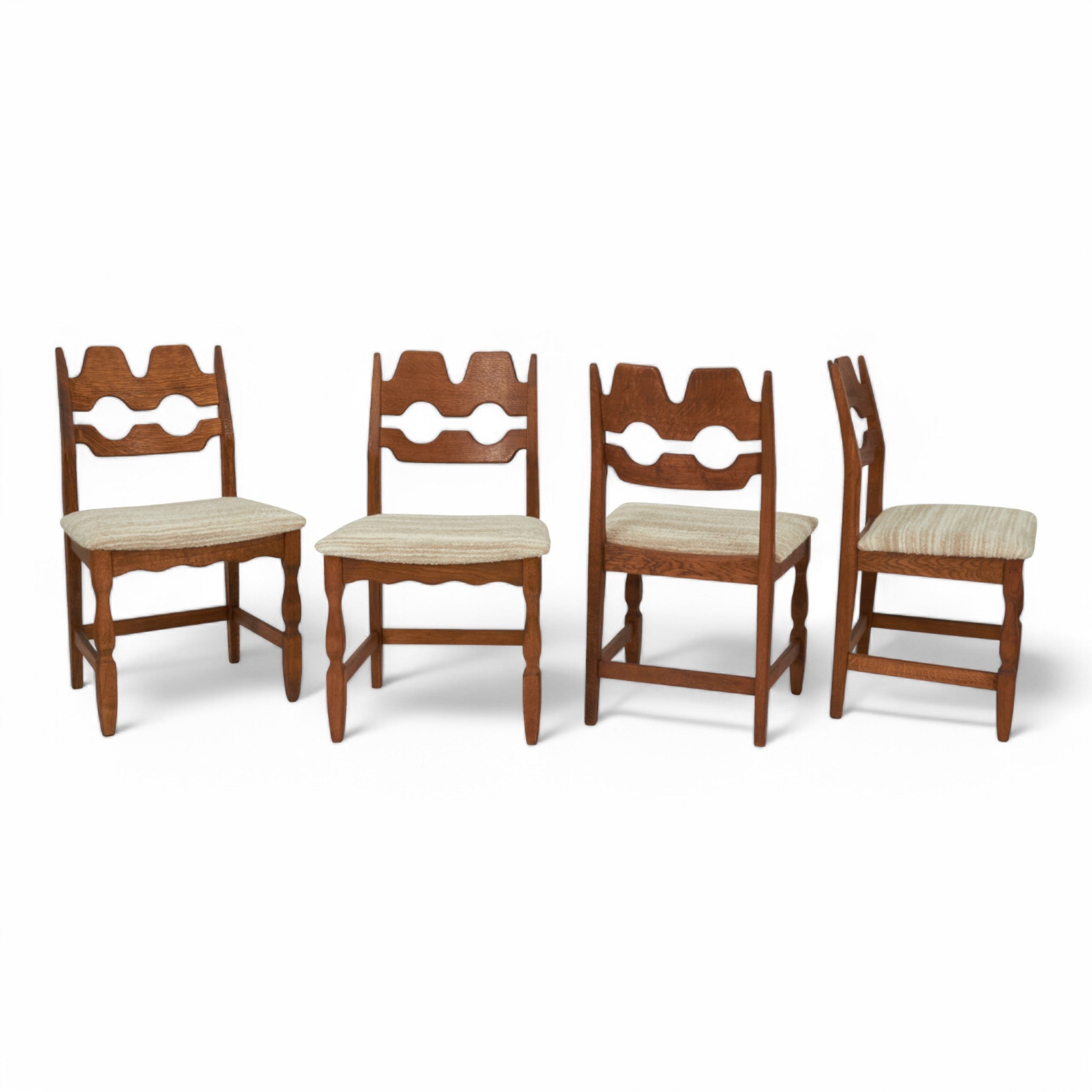 A rare set of four vintage Danish dining chairs by renowned mid-century designer Henning Kjærnulf, produced in the 1960s. These sculptural chairs feature signature razor-style backrests and solid oak frames, showcasing exceptional Scandinavian craftsmanship and timeless design.