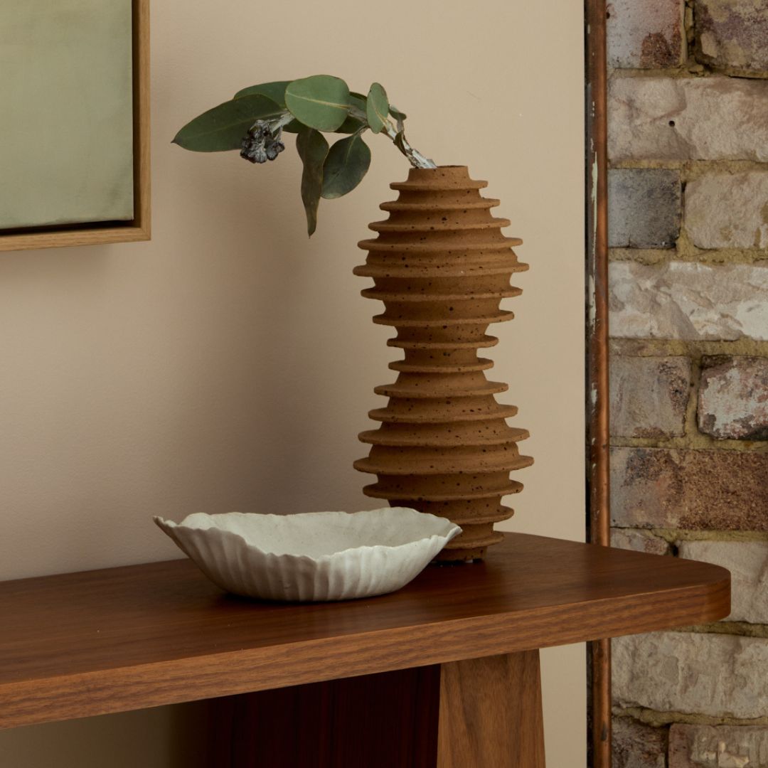 Its spiralling structure offers both sculptural interest and quiet restraint, ideal for styling in minimalist interiors or naturalistic settings where texture and craft take centre stage.