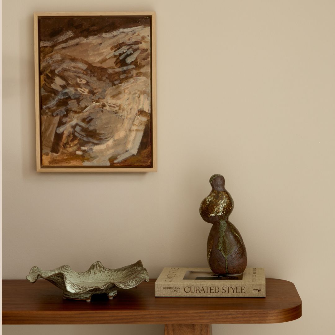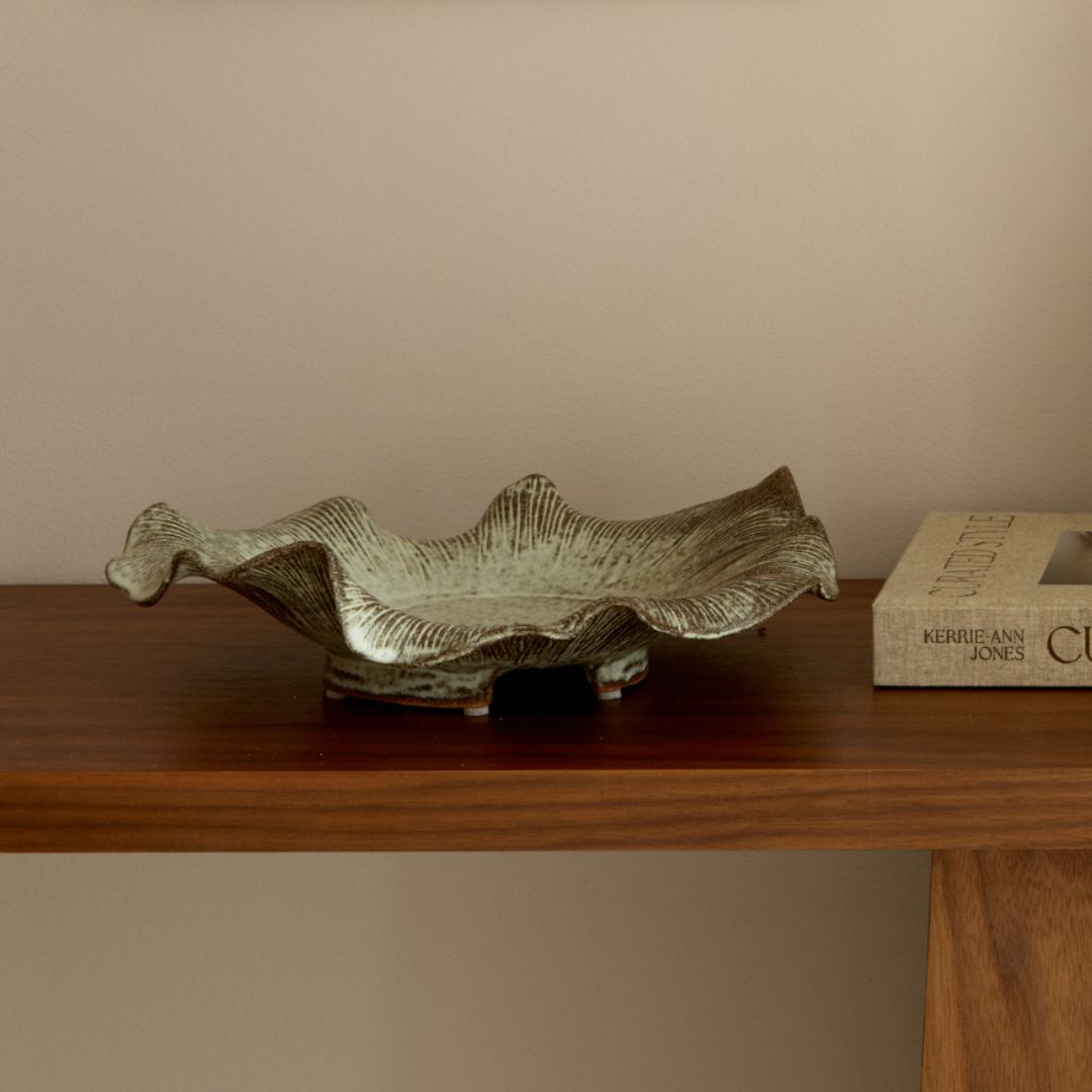 The 'Leif II' footed ceramic bowl by Tee McManus of All Day Clay is a one-of-a-kind, handcrafted vessel featuring an organic, asymmetrical form and earthy textured glaze. Its elevated base creates a refined sculptural presence, perfect for modern curated interiors.