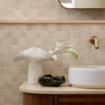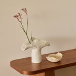 The Mizuki Vase by Tee McManus of All Day Clay is a handcrafted ceramic piece featuring an organic, fluted edge and a white rich glaze. Designed for both practical use and display, it brings artisanal charm and natural texture to contemporary interiors.